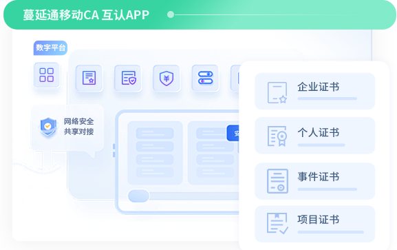 蔓延通移动CA 互认APP一款集成多CA的移动数字证书平台APP ,通过手机即可在线申领各地电子招投标平台所需的数字证书,以及完成招投标过程中的身份认证、电子签章、文件加解密等业务功能。蔓延通平台可与各级公共资源交易平台实现共享对接,共享证书信息、交易主体信息等,从服务器端实现数字证书的交叉互认,根本上解决传统CA锁带来的一系列弊端,降低交易中心工作人员压力。