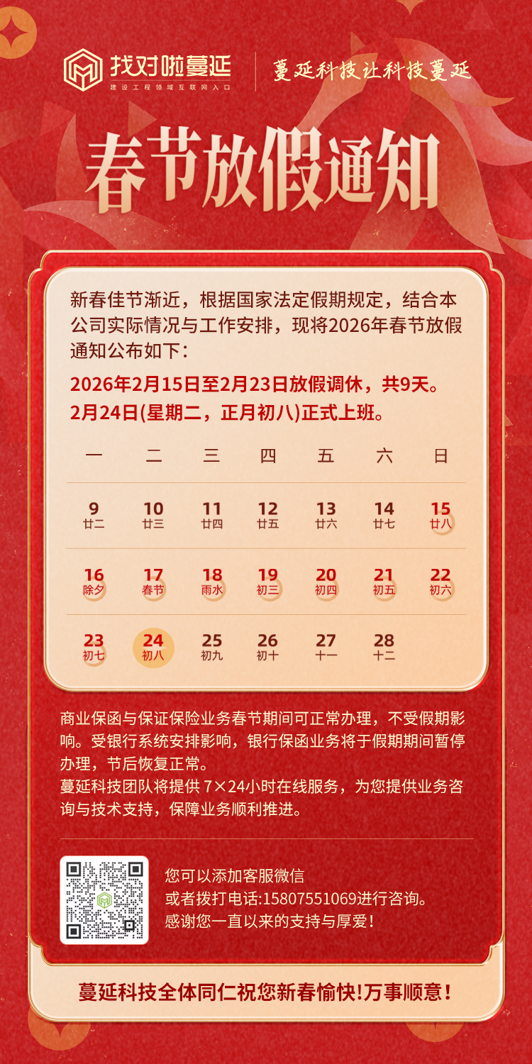 新春佳节临近,结合国家法定假期规定及本公司实际工作安排,现将2026年春节放假相关事宜温馨告知各位投标人,敬请知悉、留意: