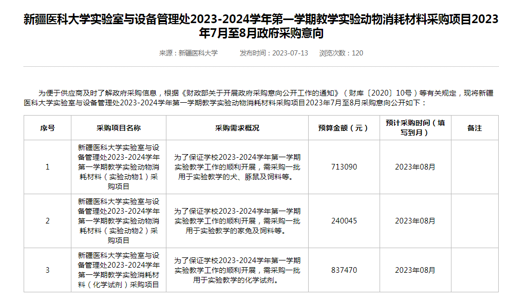 [政采云]五矿国际招标有限责任公司关于新疆医科大学实验室与设备管理处2023-2024学年第一学期教学实验动物消耗材料(实验动物2)采购项目的公开招标公告