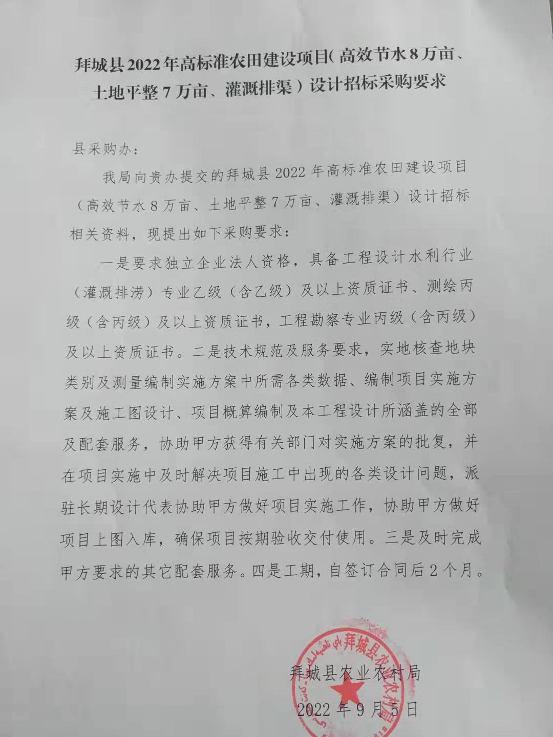 [政采云]拜城县2022年高标准农田建设项目--7万亩土地平整项目设计的公开招标公告