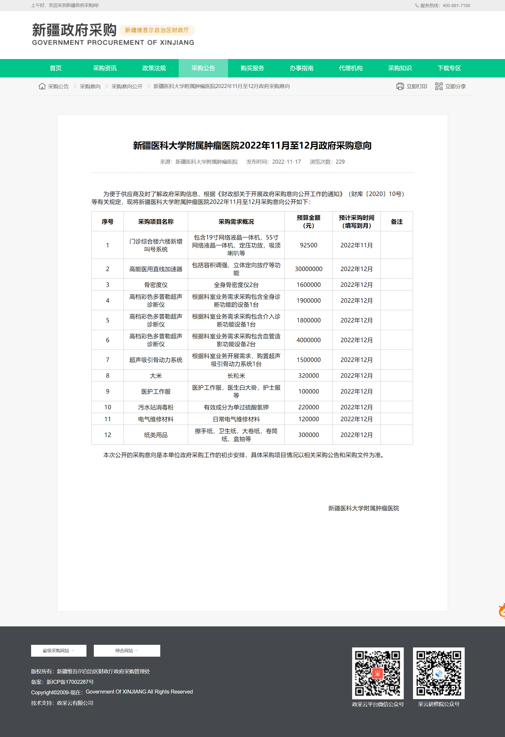新疆医科大学附属肿瘤医院2022年11月至12月政府采购意向.png