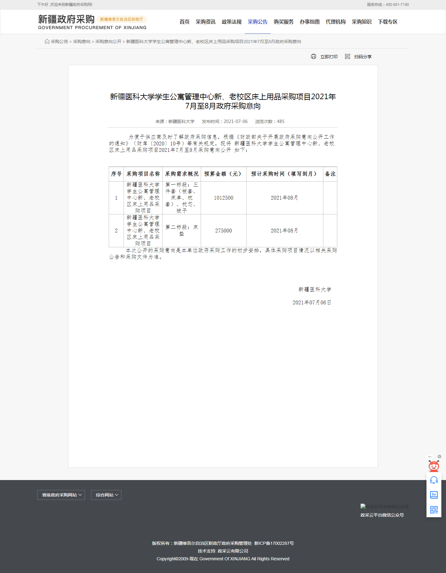新疆医科大学学生公寓管理中心新、老校区床上用品采购项目2021年7月至8月政府采购意向.png