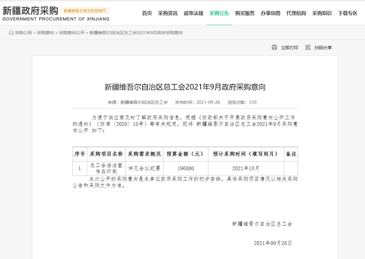 [政采云]新疆众诚易盛工程项目管理有限公司关于总工会法治宣传品印刷采购项目的竞争性磋商公告