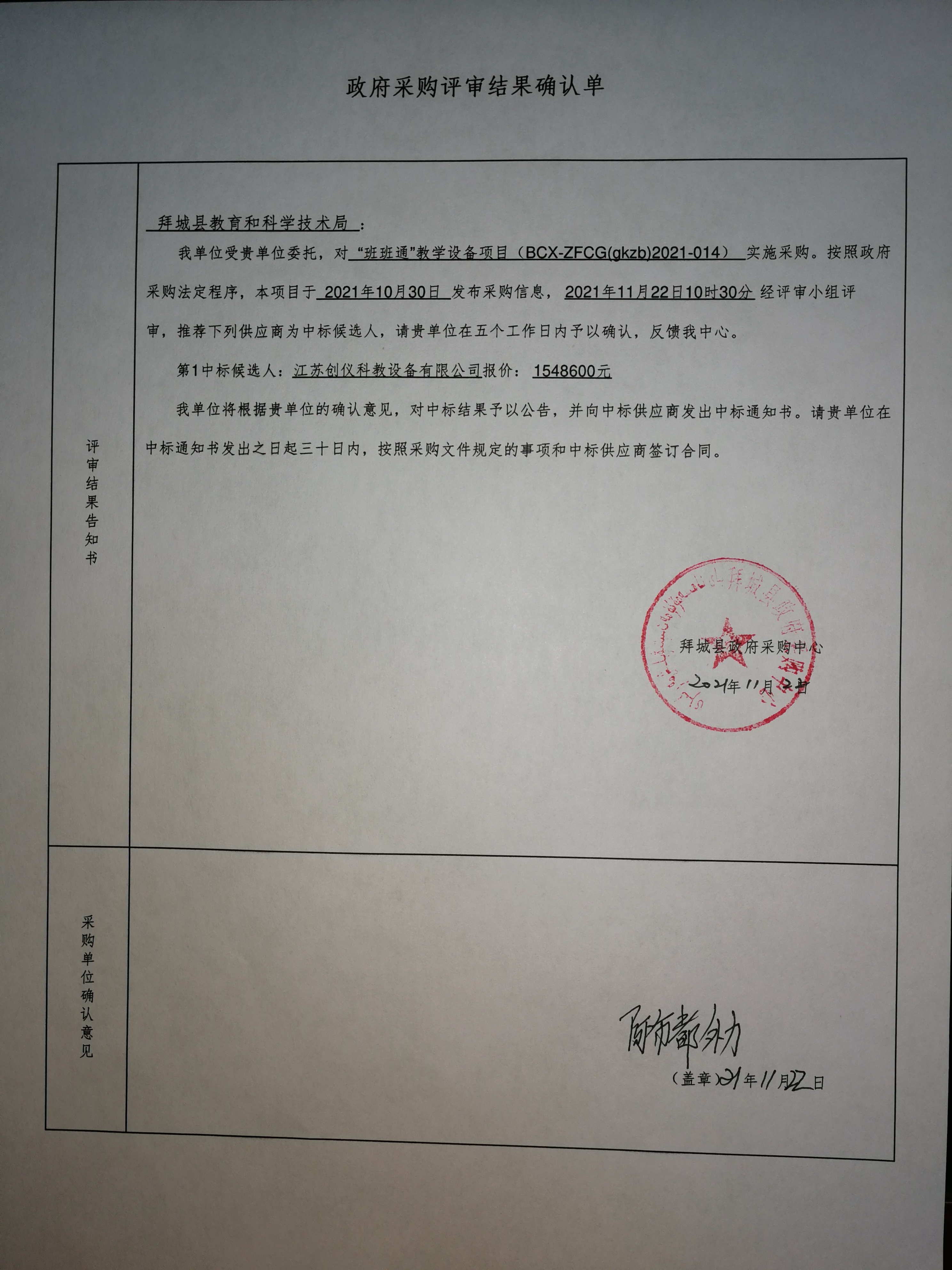 [政采云]拜城县政府采购中心关于“班班通”教学设备项目的中标(成交)结果公告