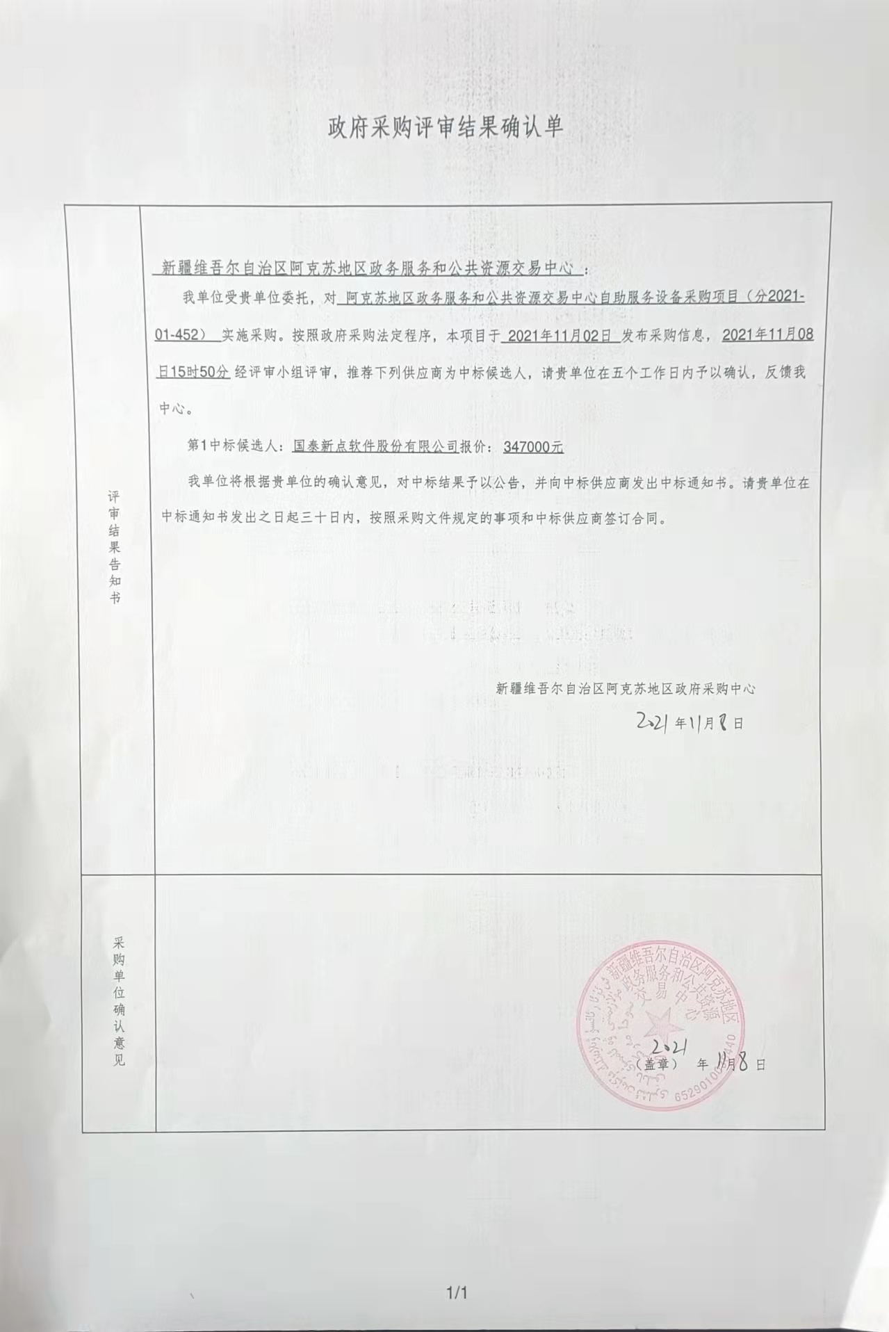 [政采云]新疆维吾尔自治区阿克苏地区政府采购中心关于阿克苏地区政务服务和公共资源交易中心自助服务设备采购项目的中标(成交)结果公告