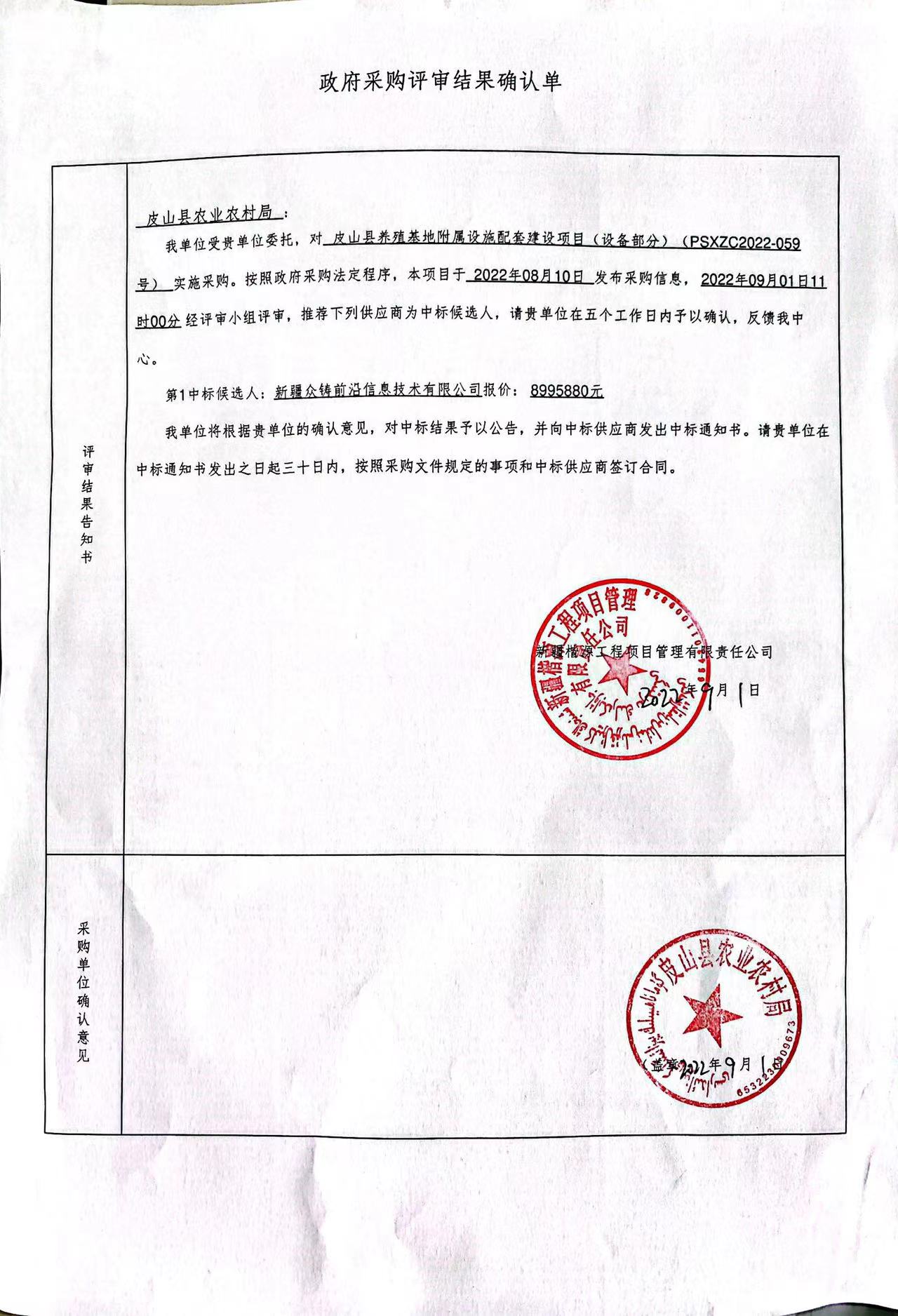 [政采云]皮山县养殖基地附属设施配套建设项目(设备部分)的中标(成交)结果公告