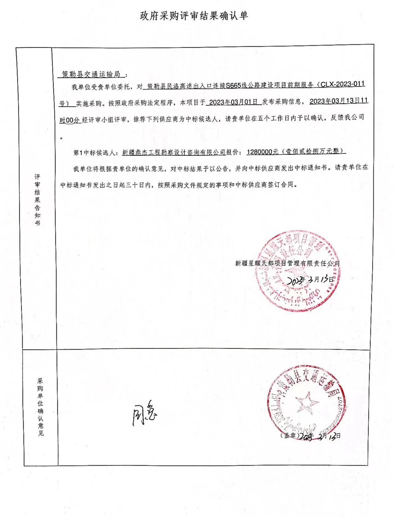 [政采云]策勒县民洛高速出入口连接S665线公路建设项目前期服务中标(成交)结果公告