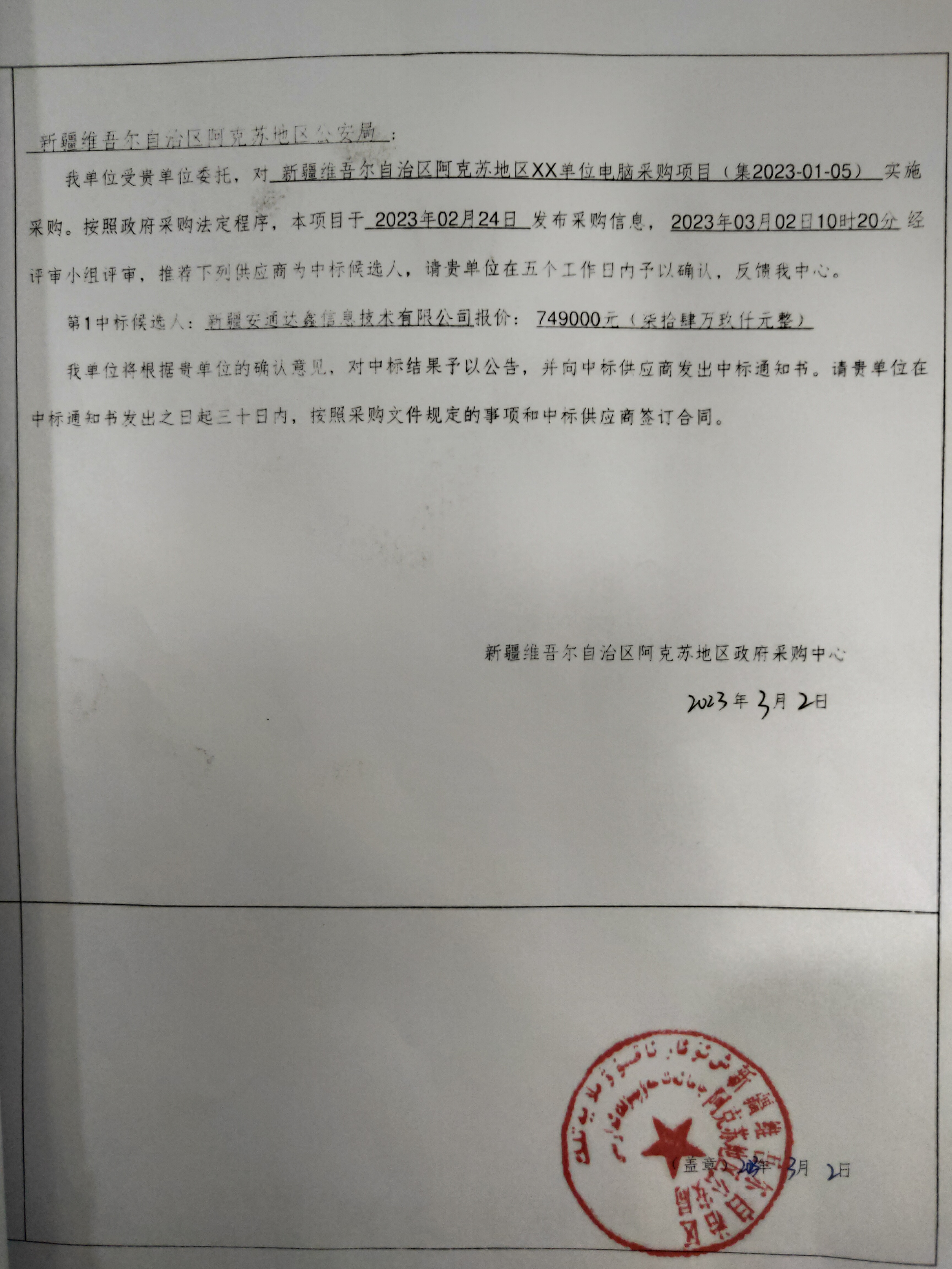 [政采云]新疆维吾尔自治区阿克苏地区政府采购中心关于新疆维吾尔自治区阿克苏地区XX单位电脑采购项目的中标(成交)结果公告
