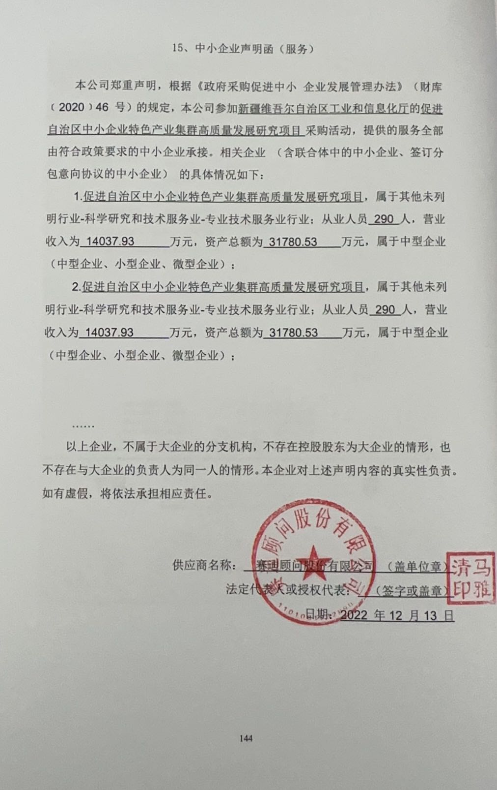 [政采云]新疆招标有限公司关于促进自治区中小企业特色产业集群高质量发展研究项目的中标(成交)结果公告