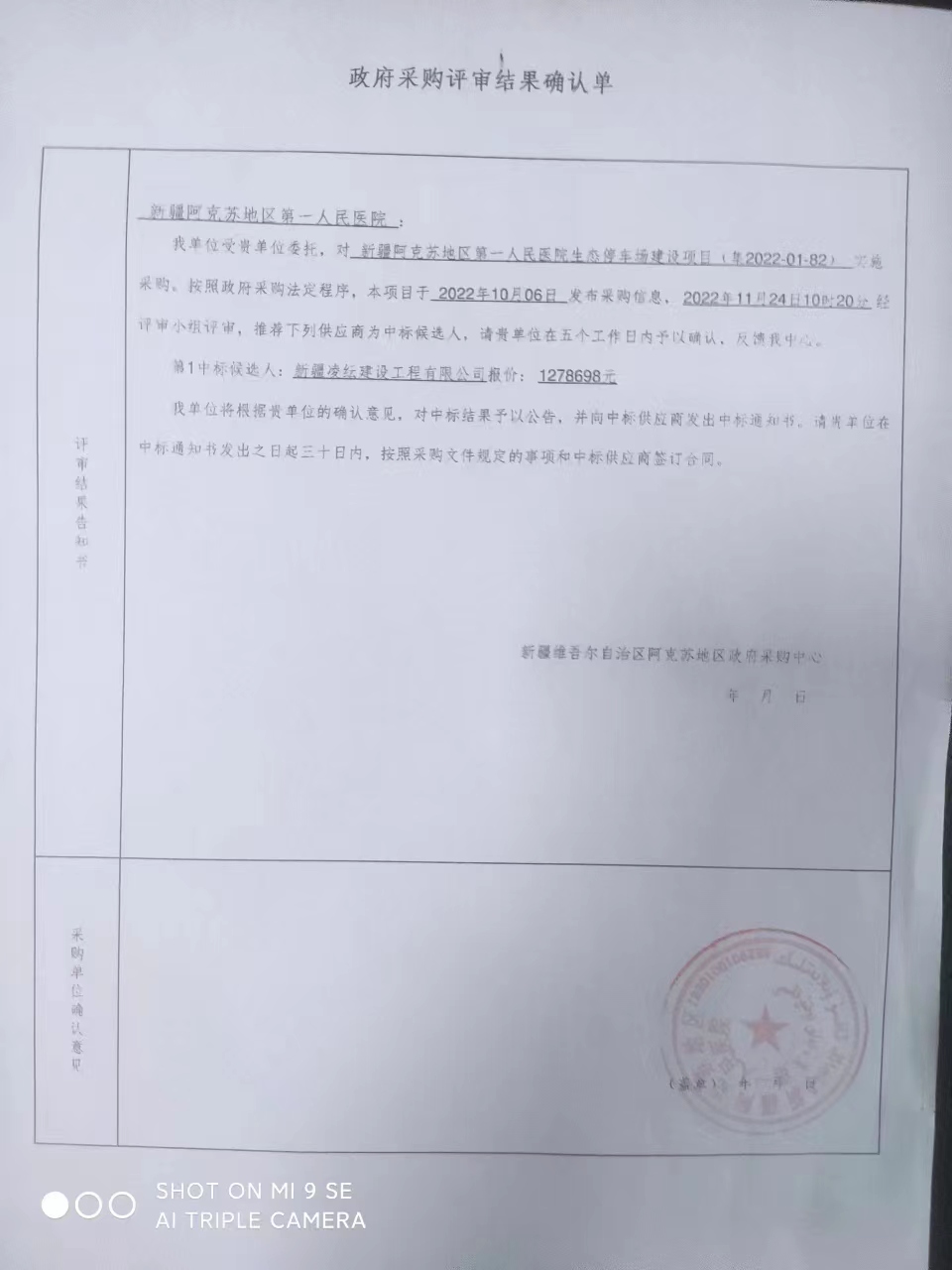 [政采云]新疆维吾尔自治区阿克苏地区政府采购中心关于新疆阿克苏地区第一人民医院生态停车场建设项目的中标(成交)结果公告