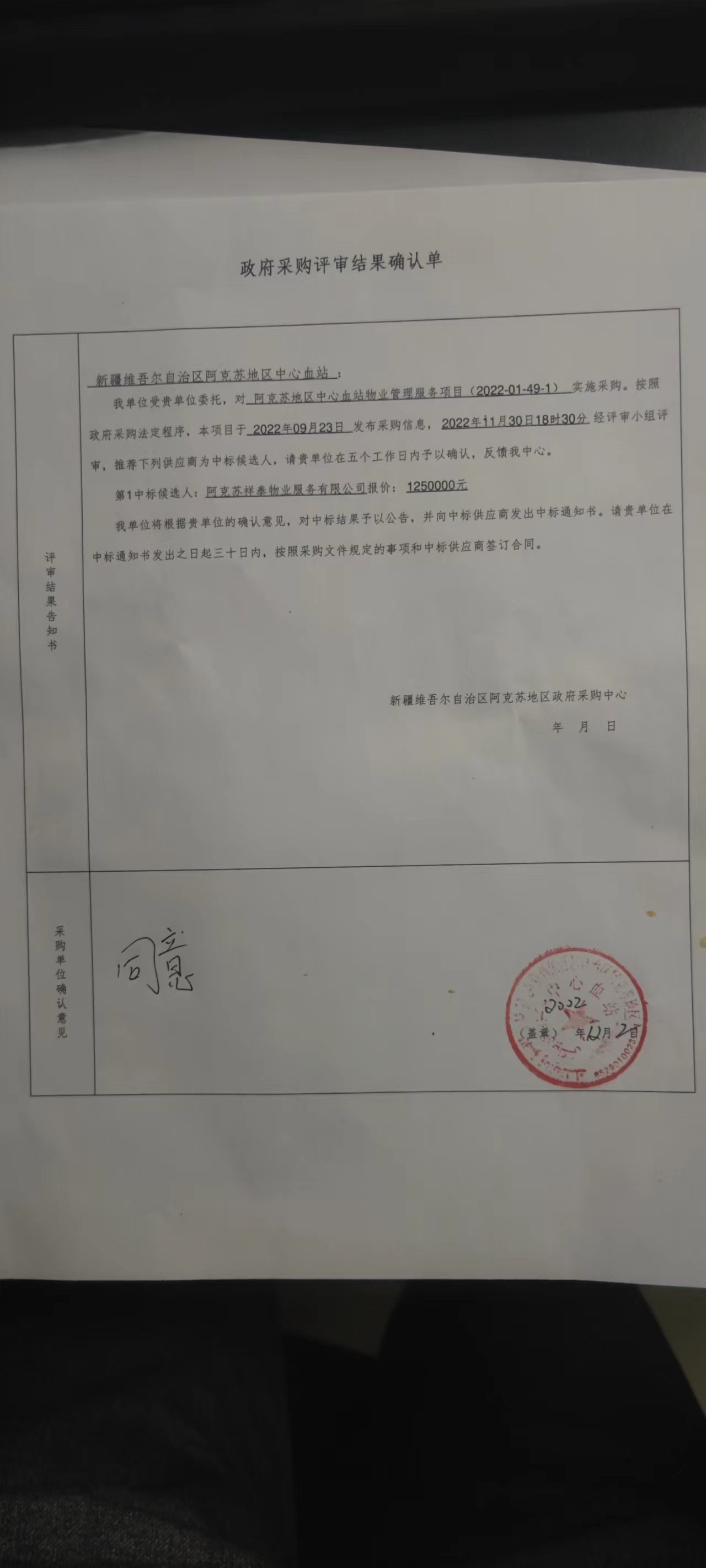 [政采云]新疆维吾尔自治区阿克苏地区政府采购中心关于阿克苏地区中心血站物业管理服务项目的中标(成交)结果公告