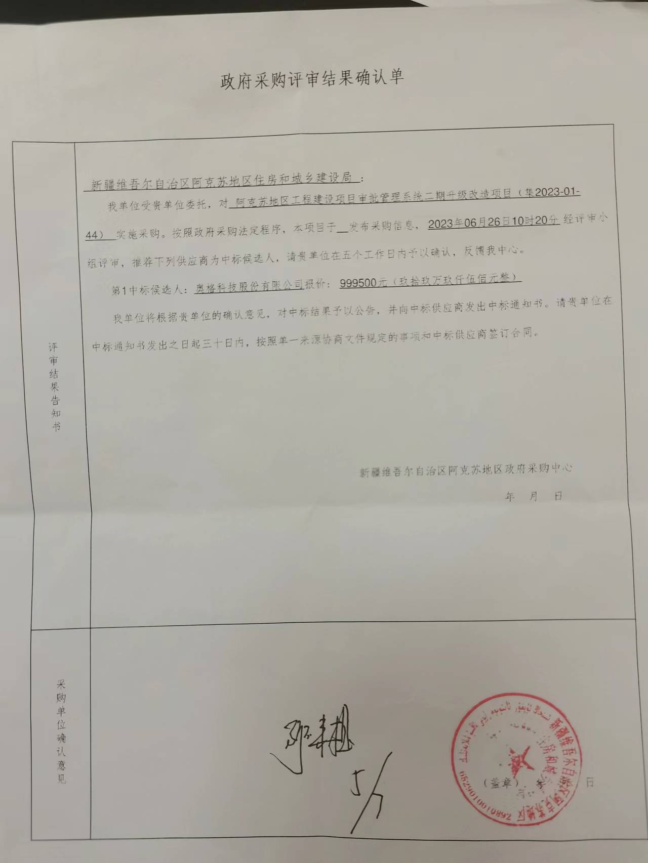 [政采云]新疆维吾尔自治区阿克苏地区政府采购中心关于阿克苏地区工程建设项目审批管理系统二期升级改造项目中标(成交)结果公告