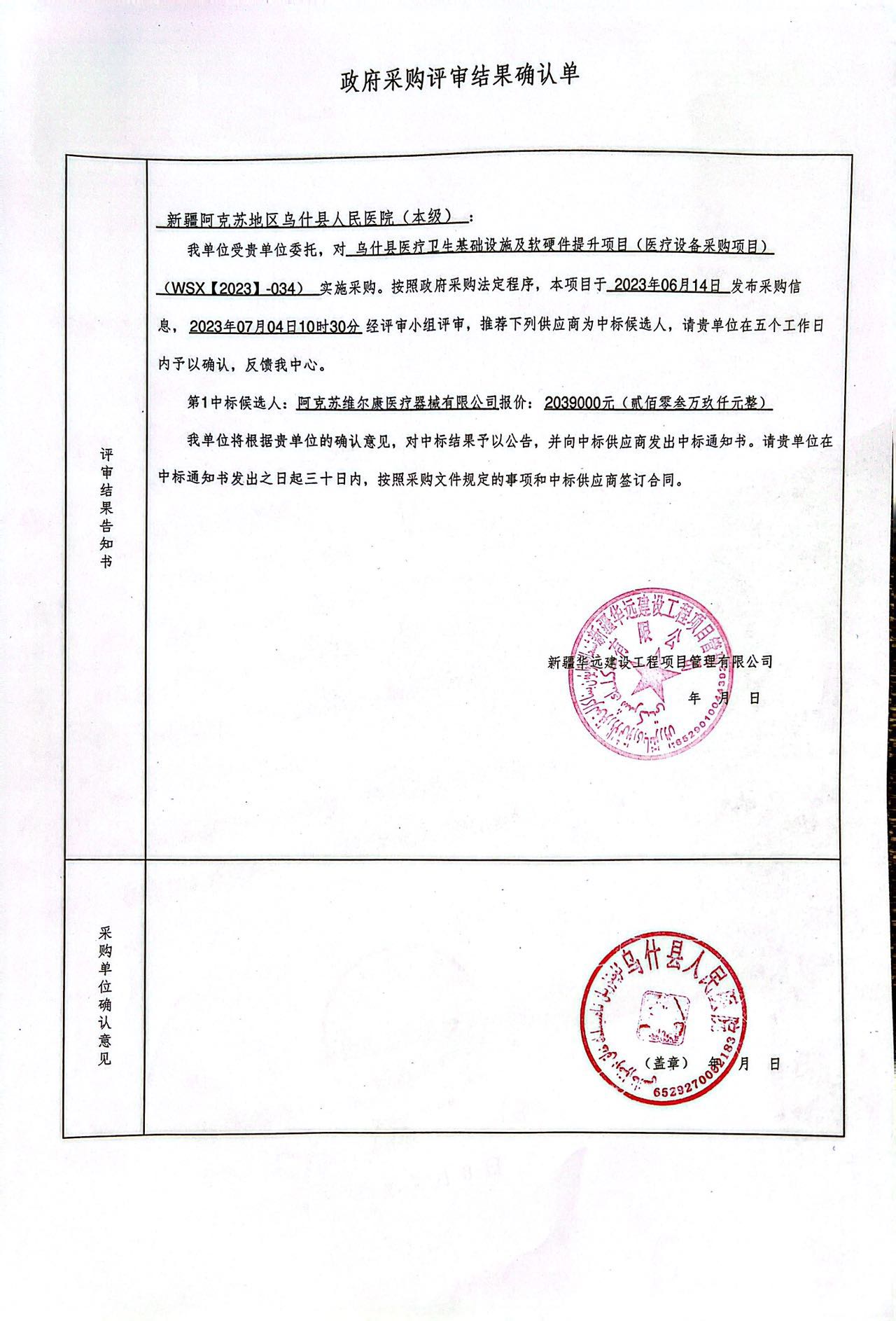 [政采云]乌什县医疗卫生基础设施及软硬件提升项目(医疗设备采购项目)中标(成交)结果公告